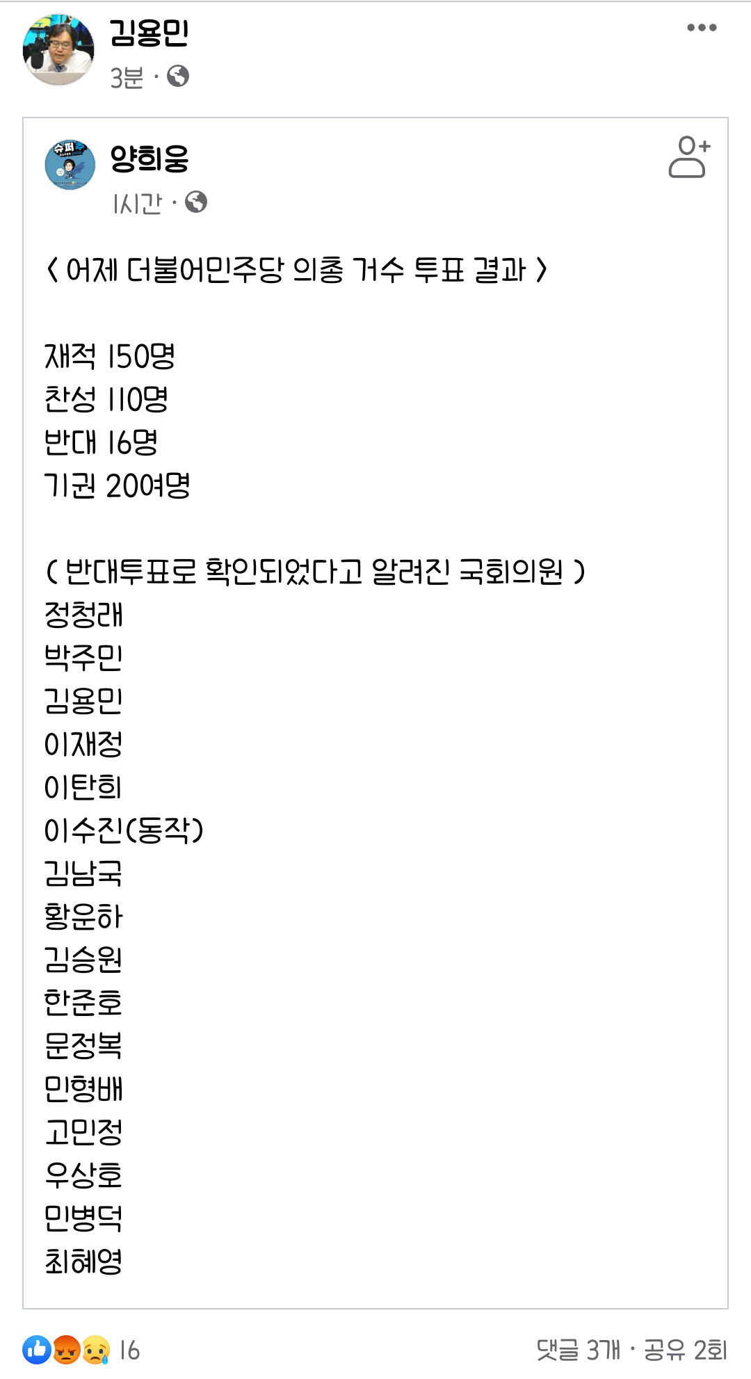 찬성 110명.. 뭐 대다수니 일일이 열거하기도 어렵워 포기하고, 반대표 던진 분만 살리겠다는 심정으로 다시 한번 기억해 본다